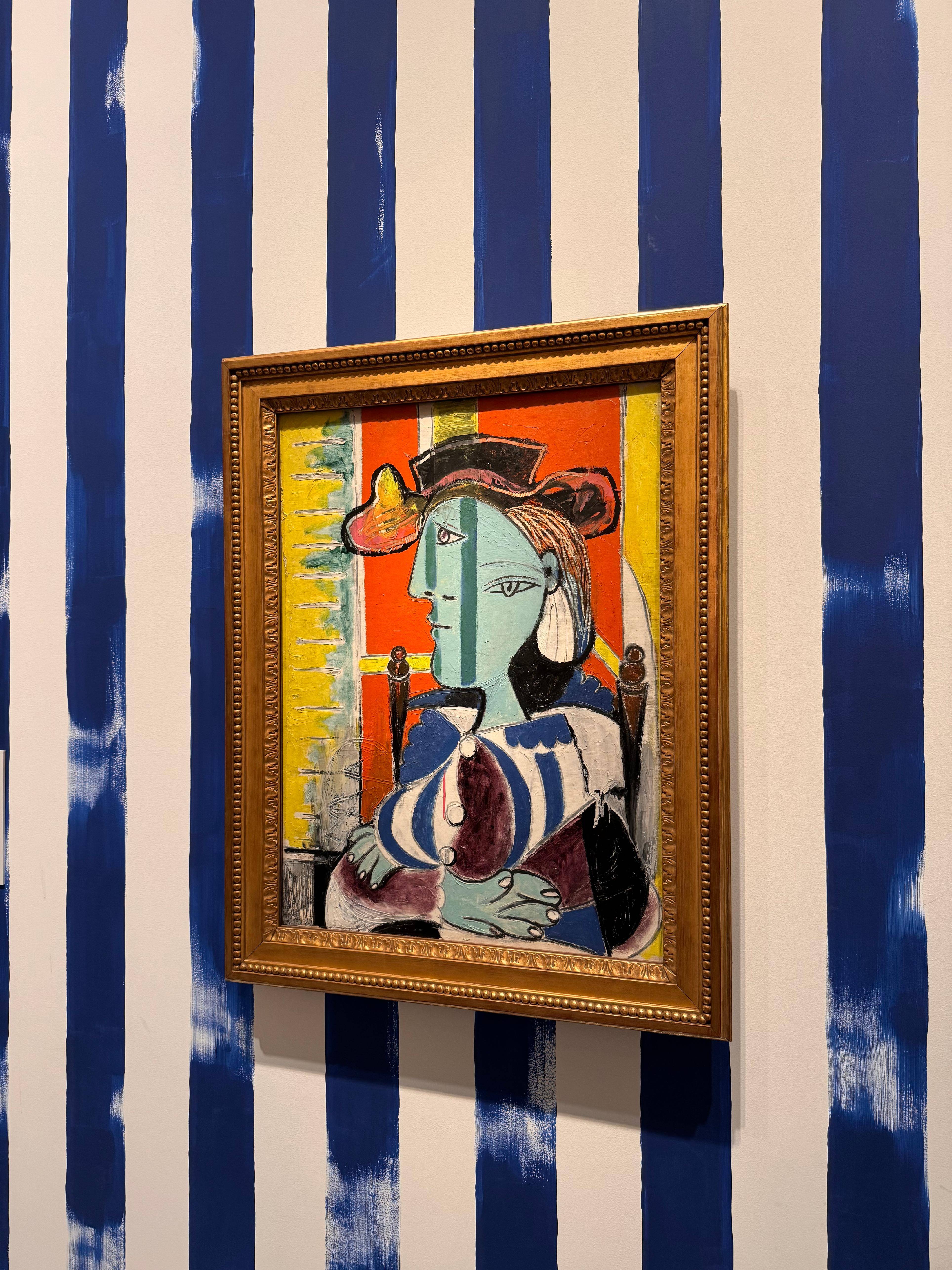 作为此次展览的艺术总监,英国时尚设计大师保罗·史密斯用色彩和图案重构了毕加索的经典作品。《阅读》展厅里墙面延伸画中的条纹,形成沉浸式空间。海报空间里,400余张复刻历史海报铺陈出艺术家的一生。