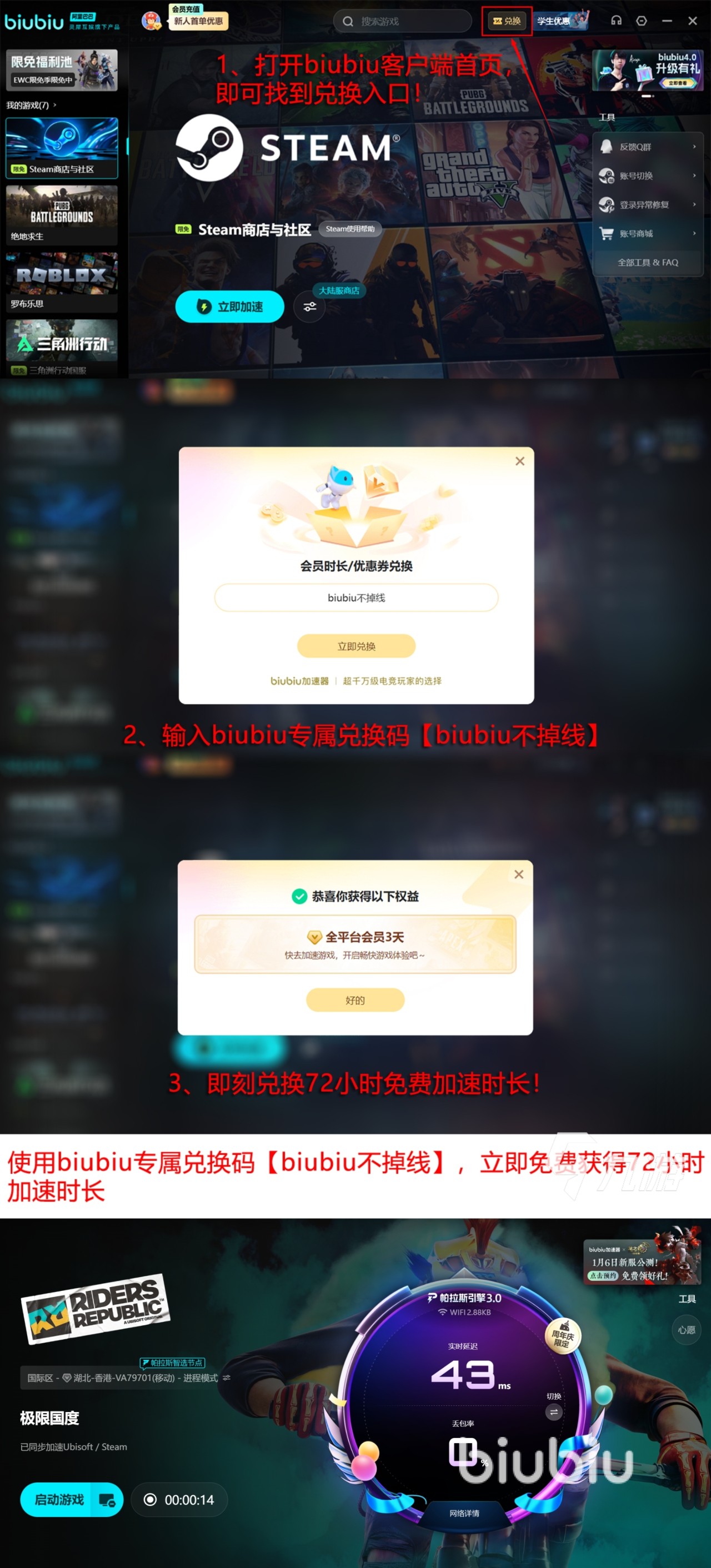 针对家庭宽带波动、Wi-Fi信号衰减等弱网场景,biubiu内置多路径冗余传输模块,可在主链路质量下降时自动切换备用通道,维持游戏会话连续性。新用户注册即享24小时全功能免费试用;所有用户输入激活码【biubiu不卡顿】,可额外获得72小时高级会员权限,累计达96小时,足够完成完整故障定位与深度体验。