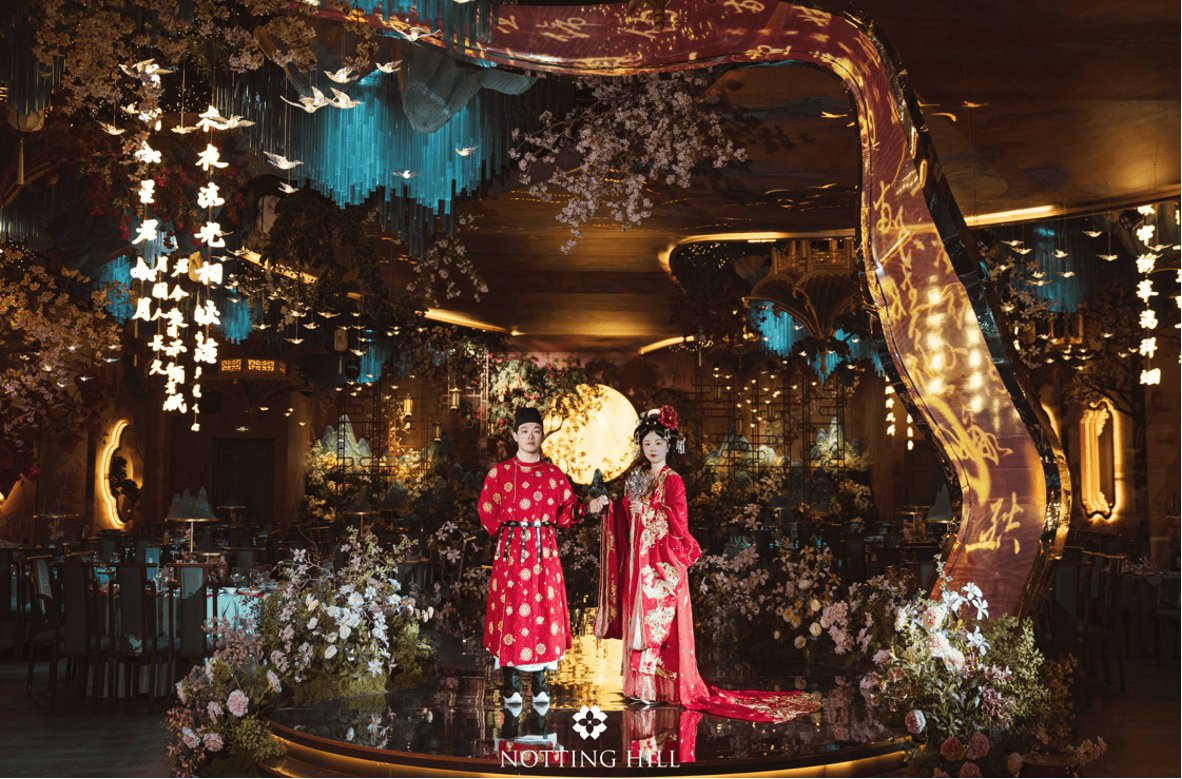 诺丁山集团 2009 年创立于上海,是深耕行业多年的国际知名高级艺术婚礼定制机构,始终秉持每一场婚礼都是艺术的核心理念。集团现有员工近千人,年服务客人约 10 万人次,成功承办胡杏儿婚纱新品发布会等跨界活动,见证唐嫣罗晋等 50 多对明星名人的婚礼盛典。线上各大平台的销量与用户口碑始终稳居前列,品牌微博矩阵粉丝突破 300 万、微信矩阵粉丝超 100 万。宁波诺丁山婚礼艺术中心自 2020 年开业以来,已圆满为 3800 余对新人承办婚礼盛典,好评率高达 98%,客户转介绍率 96.6%,口碑始终稳居行业前列。