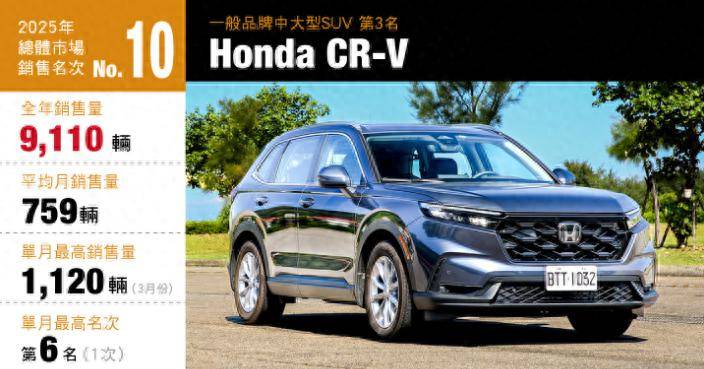 台湾车市的老熟人了,本田CR-V这几年在台湾的日子是真不算好过,去年销量还同比24年大跌34.3%。但瘦死的骆驼比马大,凭着十几年攒下的家用口碑,硬是挤上了前十。CR-V没啥花里胡哨的设计,开起来平顺不顿挫,不管是城市代步还是周末全家出游,空间都够用,就是油耗比丰田同级别略高一点。