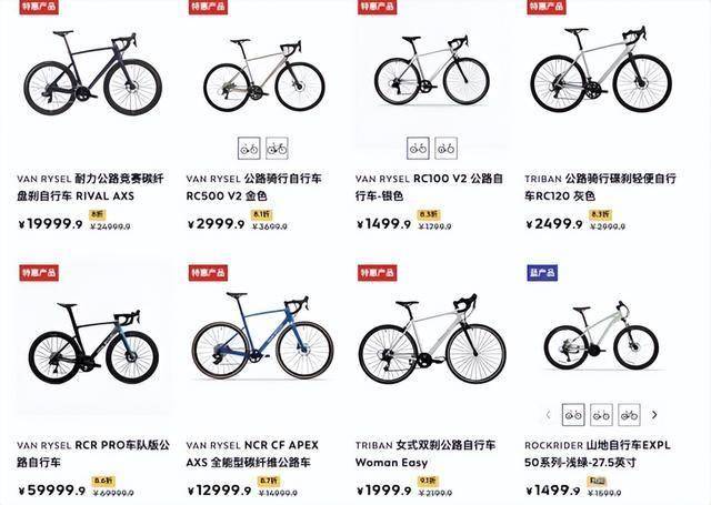 除了这两家,还有像迪卡侬这样的大集团,也推出了自己的专业骑行品牌,从一千多的入门车到几万块的比赛用车都有,想把各种需求的顾客一网打尽。