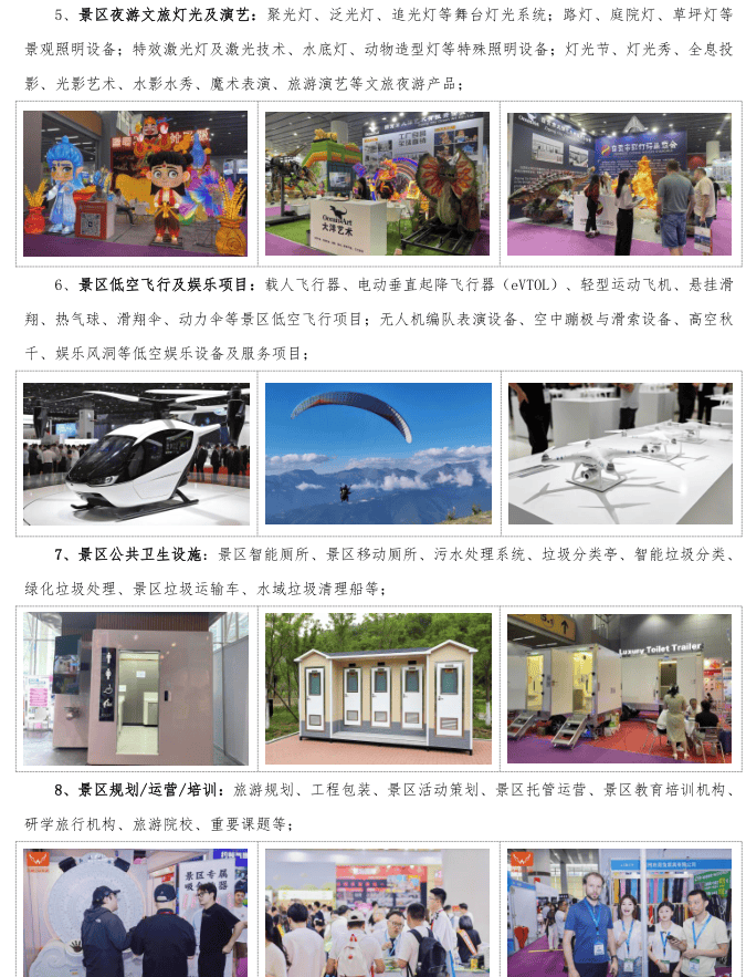 随着人们对高空体验的追求不断提升,景区低空飞行及娱乐项目成为展会的新热点。载人飞行器、电动垂直起降飞行器(eVTOL)、轻型运动飞机等,让游客能够在空中自由翱翔,俯瞰景区的壮丽景色,感受前所未有的刺激和自由 。悬挂滑翔、热气球、滑翔伞、动力伞等项目,让游客在蓝天白云间尽情享受飞行的乐趣,与大自然亲密接触 。无人机编队表演设备可以编排各种精美的图案和造型,在夜空中闪烁着绚丽的灯光,为景区带来一场震撼的视觉表演 。空中蹦极与滑索设备、高空秋千、娱乐风洞等低空娱乐设备及服务项目,为景区开拓了全新的娱乐领域,满足了游客对刺激与新奇的渴望 。这些低空飞行及娱乐项目,为景区增添了独特的娱乐体验,吸引了更多追求刺激和新奇的游客,同时也提升了景区的竞争力和吸引力。